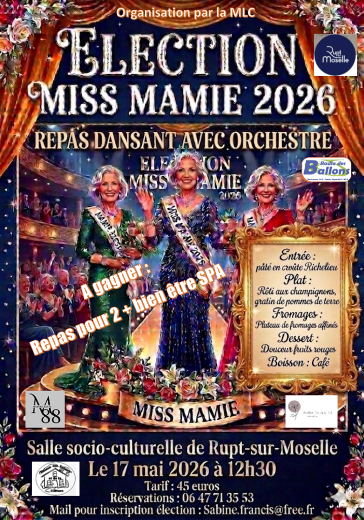 #RuptSurMoselle #Vosges #ÉvénementLocal #MissMamie #Fête #RepasDansant #Convivialité #AnimationLocale #VieLocale #SortirDansLesVosges #Tradition #MomentPartage #Orchestre #DimancheFestif